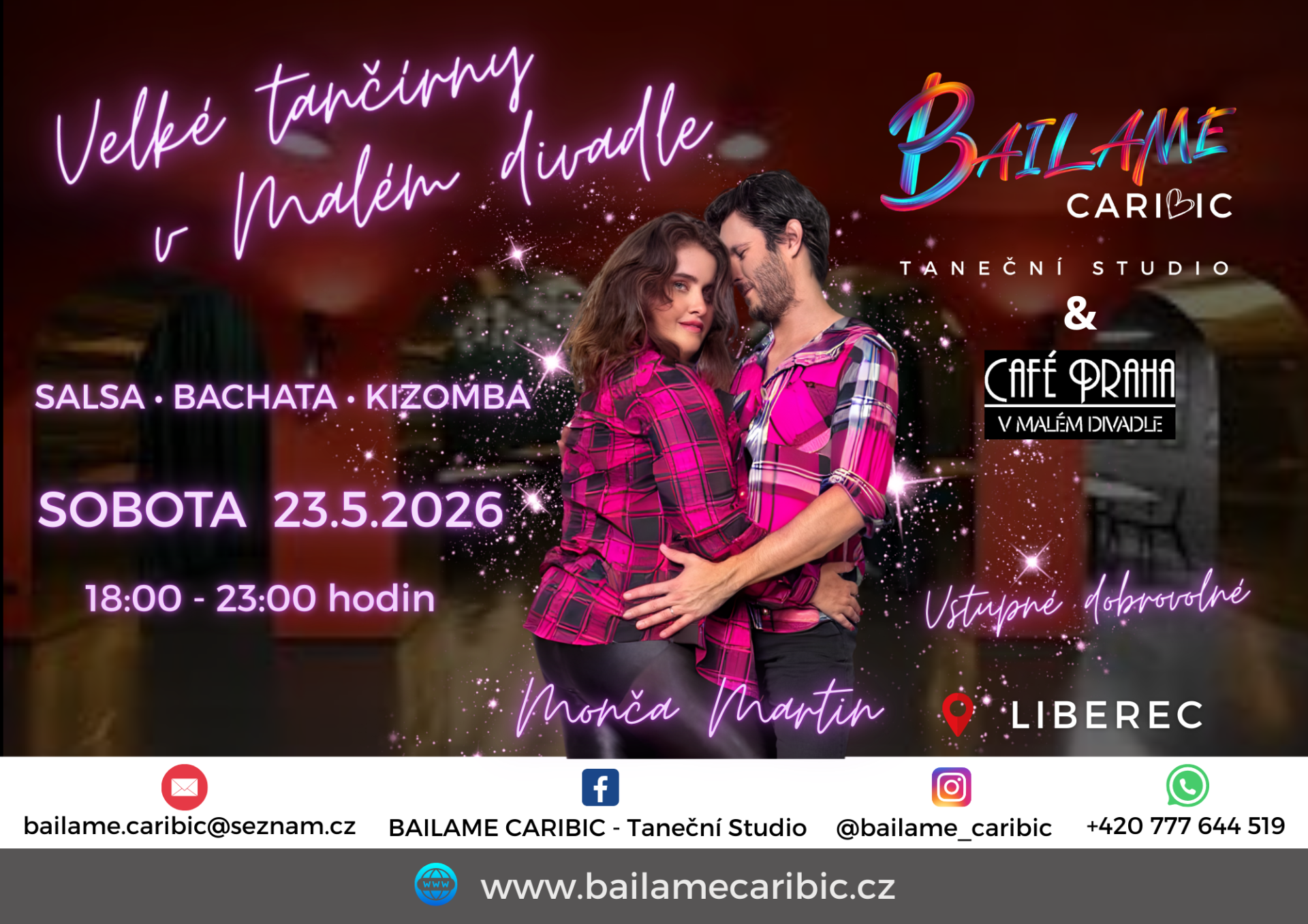 drinků, dobrot na baru a ladného pohybu! Skvělá hudba, přátelská atmosféra a parket jen pro vás! Nechte se unést rytmy a přijďte si zatancovat!
