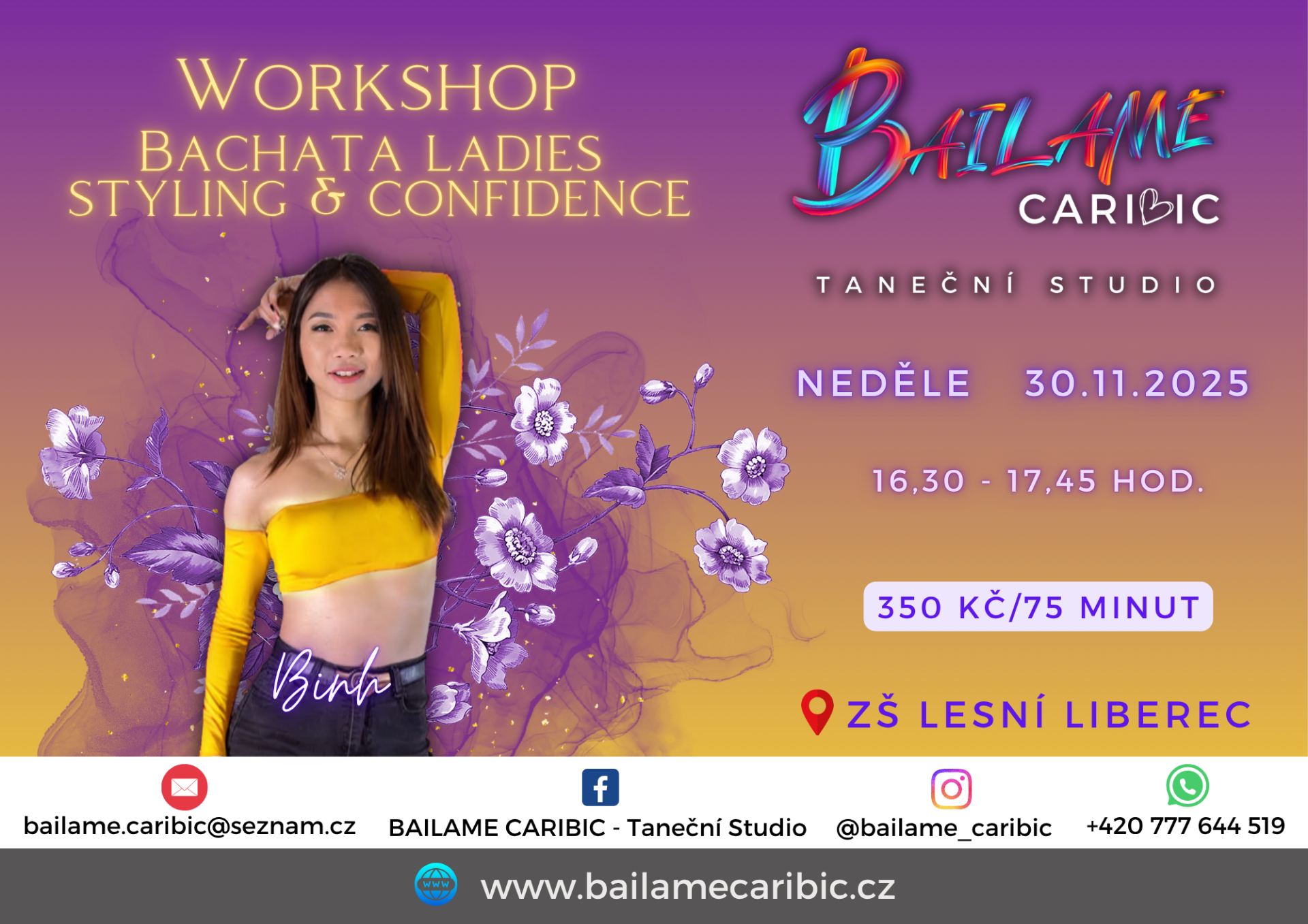 Pojďte si s námi užít ženskou energii a ladné pohyby, které uplatníte nejen jako sólo tanečnice, ale také v párové bachatě. Binh vám připravila styling uplatnitelný i v páru, pojďte se naučit při tanci vypadat skvěle a sebevědomě.